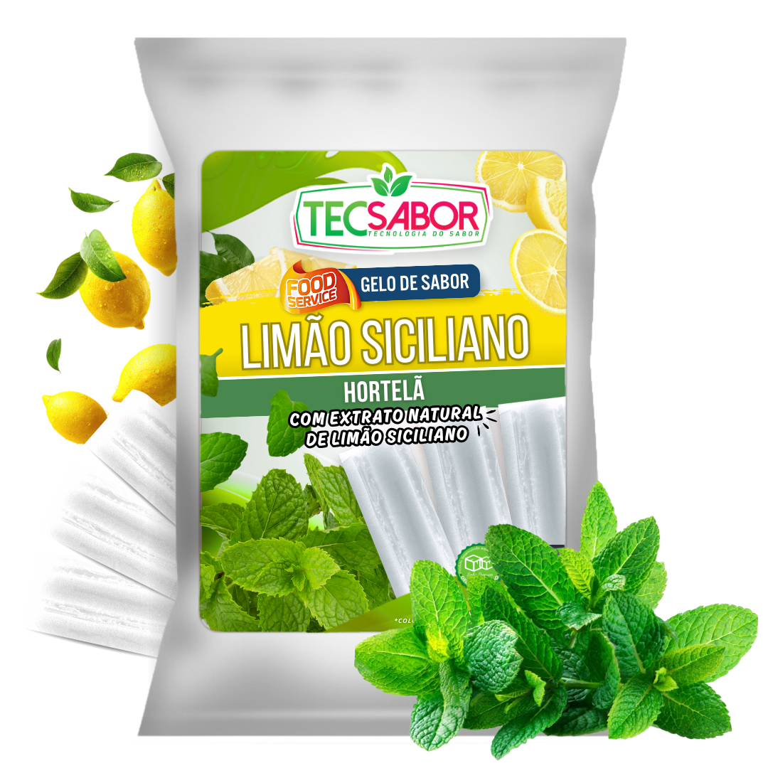 Base para produção de gelo de sabor extrato natural de limão siciliano com hortelã. Ideal para bebidas e consumo direto. Não mela, não solta pó e garante sabor consistente do inicio ao fim do seu drink.