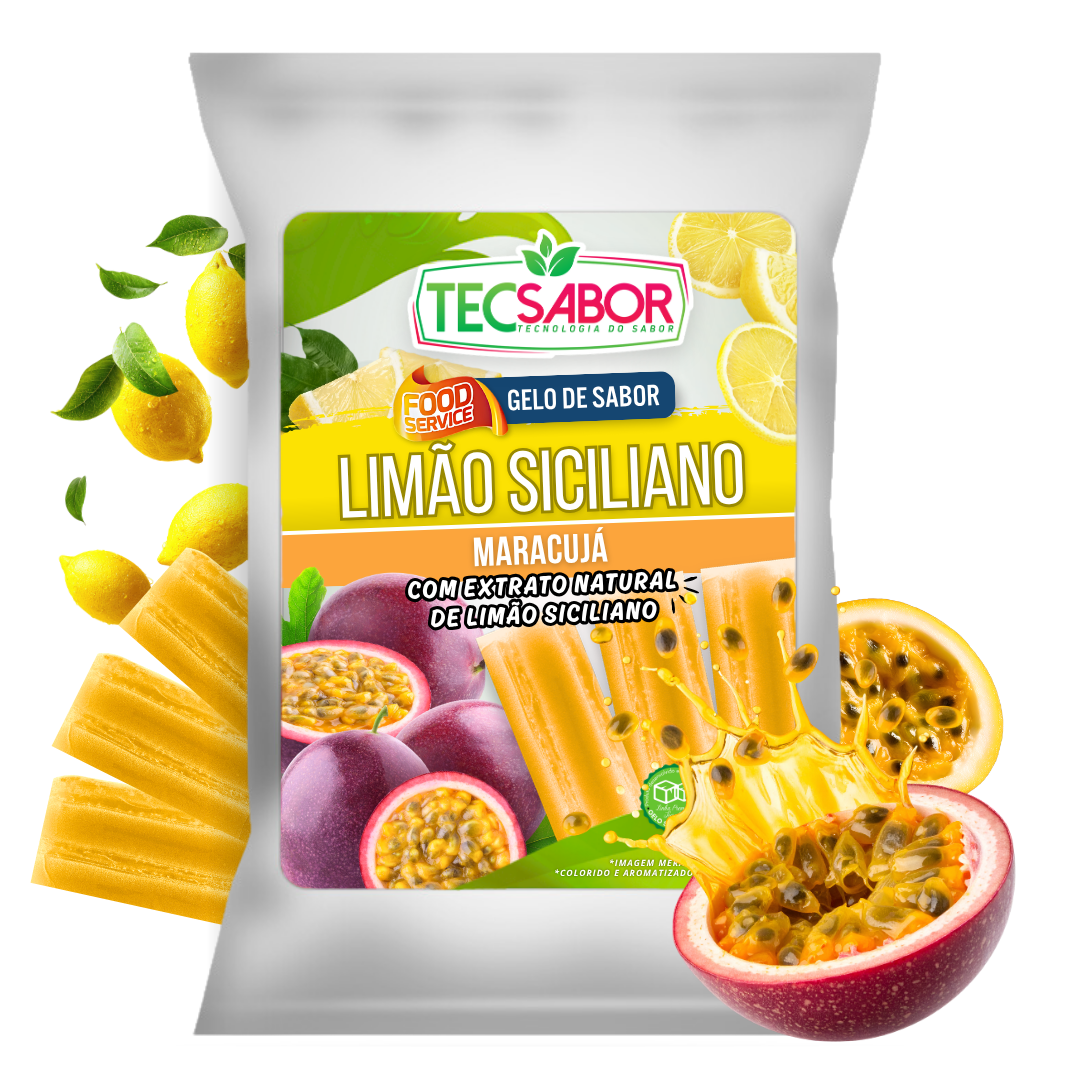 Base para produção de gelo de sabor extrato natural de limão siciliano com maracujá. Ideal para bebidas e consumo direto. Não mela, não solta pó e garante sabor consistente do inicio ao fim do seu drink.