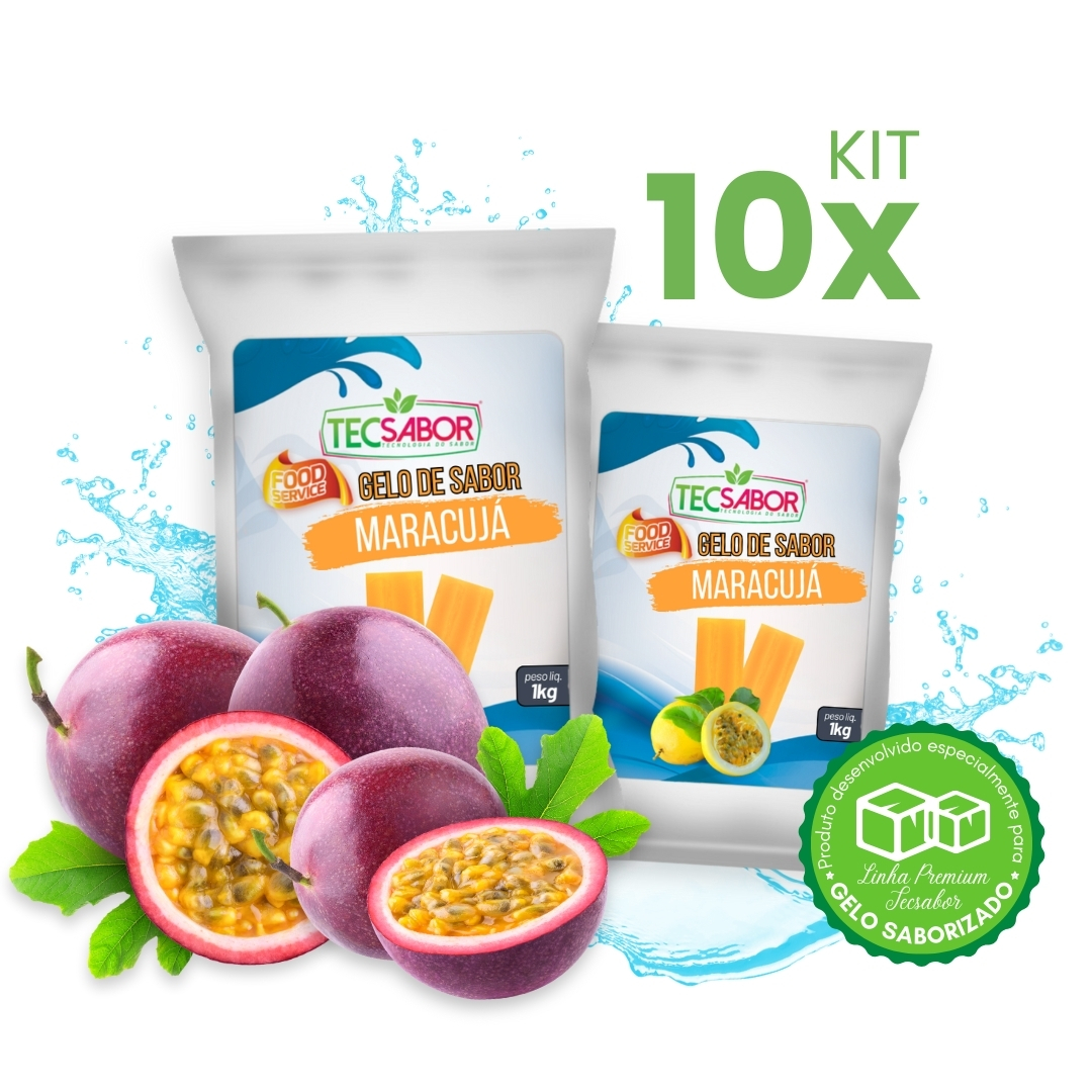 Kit com 10x bases para produção de gelo de sabor maracujá. Ideal para bebidas e consumo direto. Não mela, não solta pó e garante sabor consistente do inicio ao fim do seu drink.