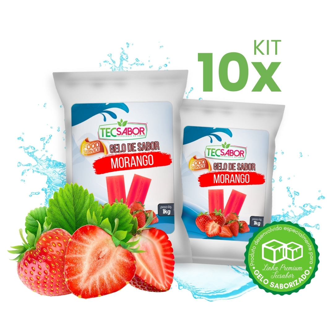 Kit com 10x bases para produção de gelo de sabor morango. Ideal para bebidas e consumo direto. Não mela, não solta pó e garante sabor consistente do inicio ao fim do seu drink.