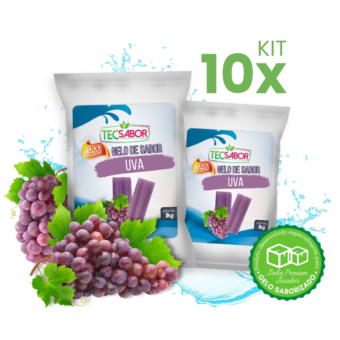 Kit com 10x bases para produção de gelo de sabor uva. Ideal para bebidas e consumo direto. Não mela, não solta pó e garante sabor consistente do inicio ao fim do seu drink.