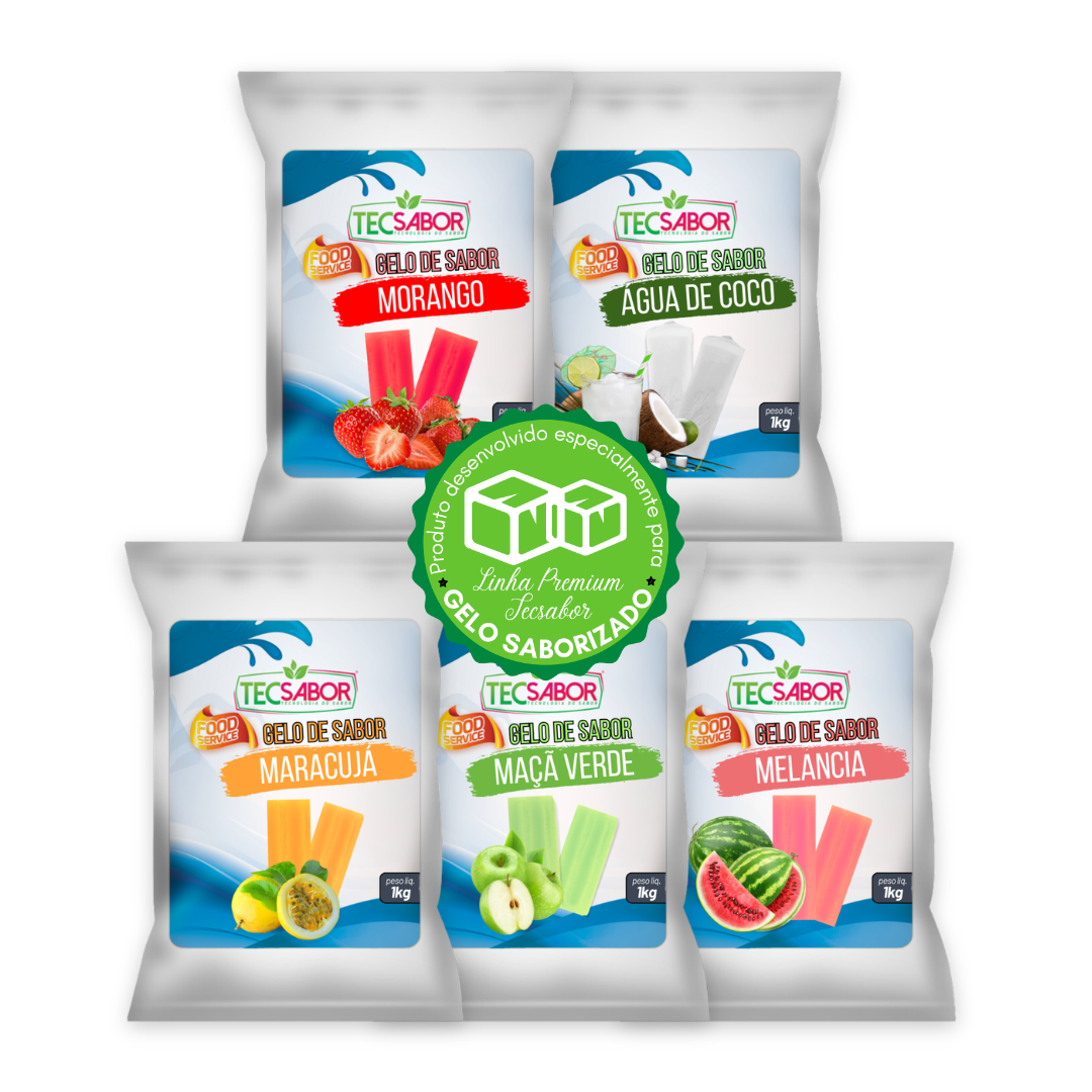 Kit com 5 bases para produção de gelo de sabor, sendo: água de coco, maracujá, maçã verde, melancia e morango. Ideal para bebidas e consumo direto. Não mela, não solta pó e garante sabor consistente do inicio ao fim do seu drink.